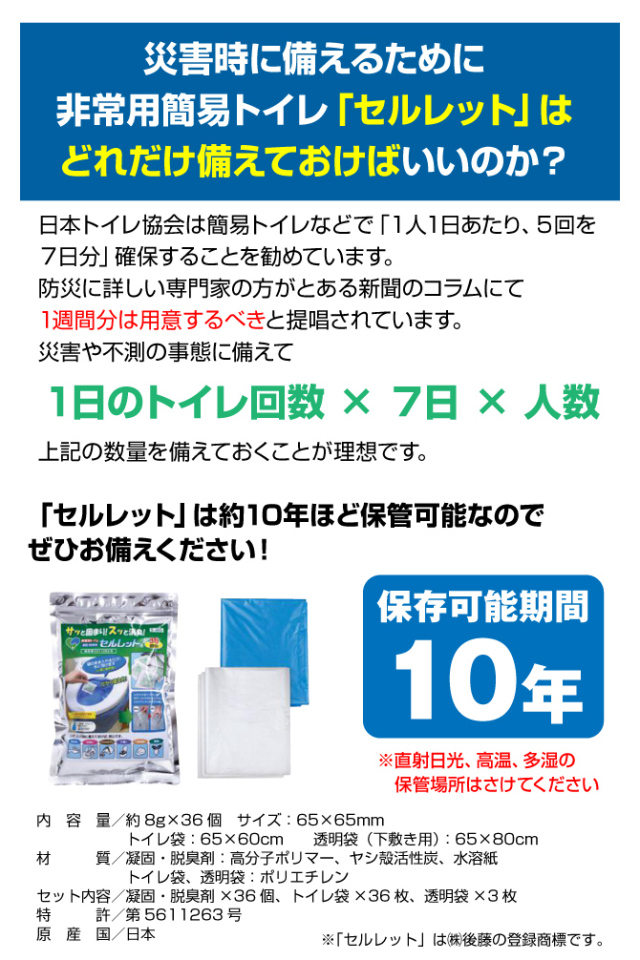 TOP商品一覧 一般商品 簡易トイレ セルレット 凝固剤 消臭 脱臭 36回分 価格: ¥5,000 (税込 ¥5,500) [ポイント還元 55ポイント~] 販売期間: 数量: 個 在庫: ○ 在庫 ○ 返品についての詳細はこちら